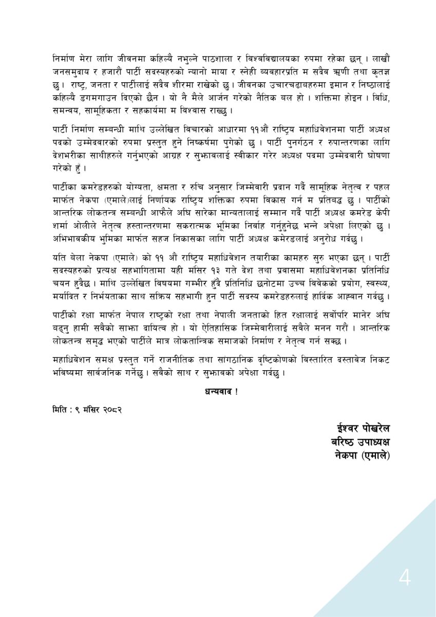 नेकपा एमालेका वरिष्ठ उपाध्यक्ष ईश्वर पोखरेलले केन्द्रीय अध्यक्ष पदमा उम्मेदवारी घोषणा गरेका छन्। मंगलबार एक वक्तव्य जारी गर्दै पोखरेलले एमालेको ११ औँ महाधिवेशनका लागि अध्यक्ष पदमा उम्मेदवारी घोषणा गरेका हुन्।
