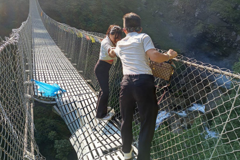 ओखलढुङ्गाको सेप्ली झरना जाने झोलुङ्गे पुलमा माथिबाट खसेको ढुङ्गाले क्षति पुर्याउँदा पर्यटक तथा सर्वसाधारणलाई आवागमनमा सास्ती भएको छ ।
