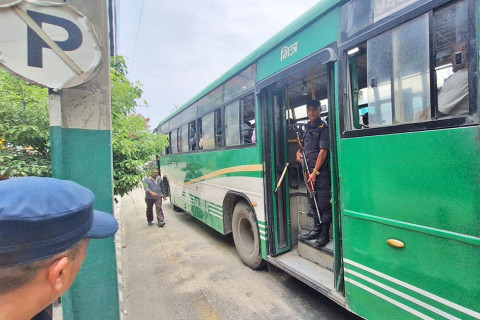 बन्दुकधारी प्रहरीको सुरक्षा घेरामा साझाका बस