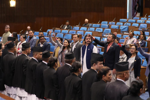 भिजिट भिसा प्रकरणमा गृहमन्त्री रमेश लेखकको राजीनामा माग गर्दै उनीहरूले संसद् बैठकमा नाराबाजी गरेका हुन्।