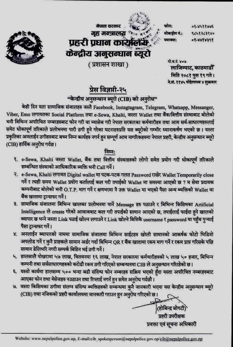 ‘यस्तो कार्यमा हालसम्म ५०० भन्दा बढी सन्दिग्ध फोन नम्बरहरू सक्रिय भएको हुँदा यस्ता अपरिचित नम्बरबाट आएको फोन तथा मेसेजहरू नउठाउन र रिप्लाई नदिन’ सिआइबीले आग्रह गरेको छ ।