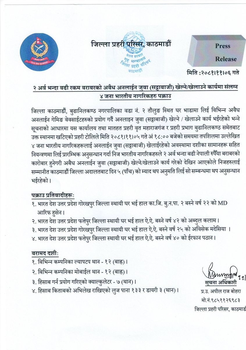 उनीहरूलाई काठमाडौँ, बुढानीलकण्ठ नगरपालिका तौलुङ स्थित घर भाडामा लिई विभिन्न अवैध अनलाइन गेमिङ वेबसाइट प्रयोग गर्दै अनलाइन जुवा खेलाउने गरेको गोप्य सूचनाका आधारमा पक्राउ गरिएको प्रहरीले जानकारी दिएको छ।