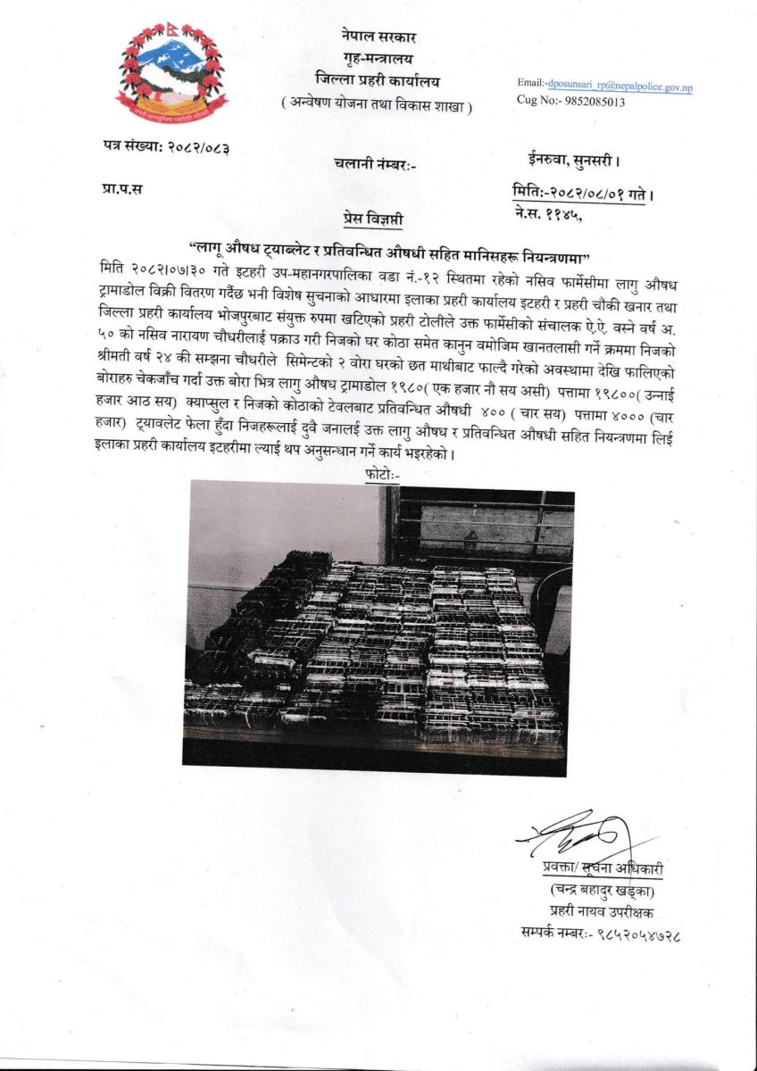 फार्मेसीमा ट्रामाडोलको अवैध बिक्री वितरणको सूचनामा प्रहरी टोलीले छापा मारेको छ। इटहरी उपमहानगरपालिका–१२ स्थित नसिव फार्मेसीमा छापा मारेर प्रहरीले दुई जनालाई नियन्त्रणमा लिएको छ।