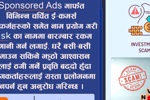 प्रहरीलेविभिन्न चर्चित ई-कमर्स प्लेटफर्महरूको नाम प्रयोग गरी 'टाक्स' का नाममा बारम्बार रकम लगानी गर्न लगाई घरै बसी-बसी कमाउन सकिने झुठो आश्वासन दिलाएर ठगी गर्ने प्रवृत्ति बढेको जनाएको छ।