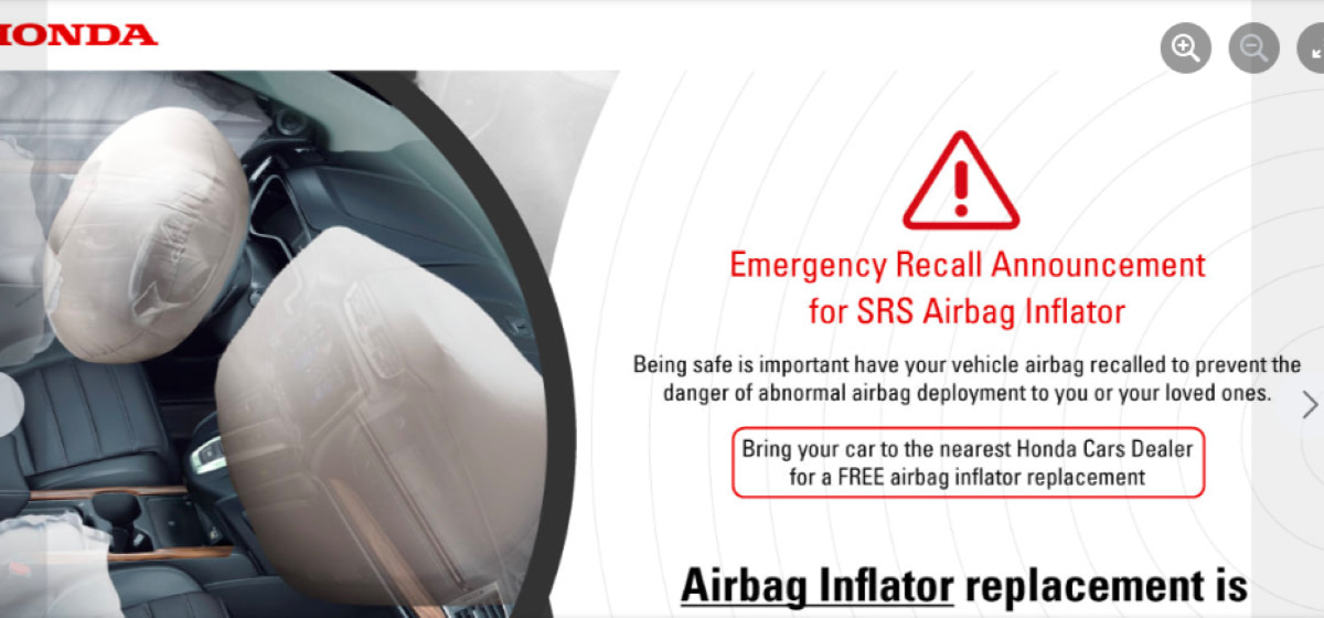 यो ‘सेफ्टी रिकल’ अभियान होण्डा मोटर कम्पनी, जापान को विश्वव्यापी सुरक्षात्मक कार्यक्रमको एक अंश हो, जसको उद्देश्य समयसँगै एयरब्याग इन्फ्लेटरमा देखिन सक्ने सम्भावित प्राविधिक समस्यालाई हटाई ग्राहकको यात्रा अझ सुरक्षित बनाउनु हो।