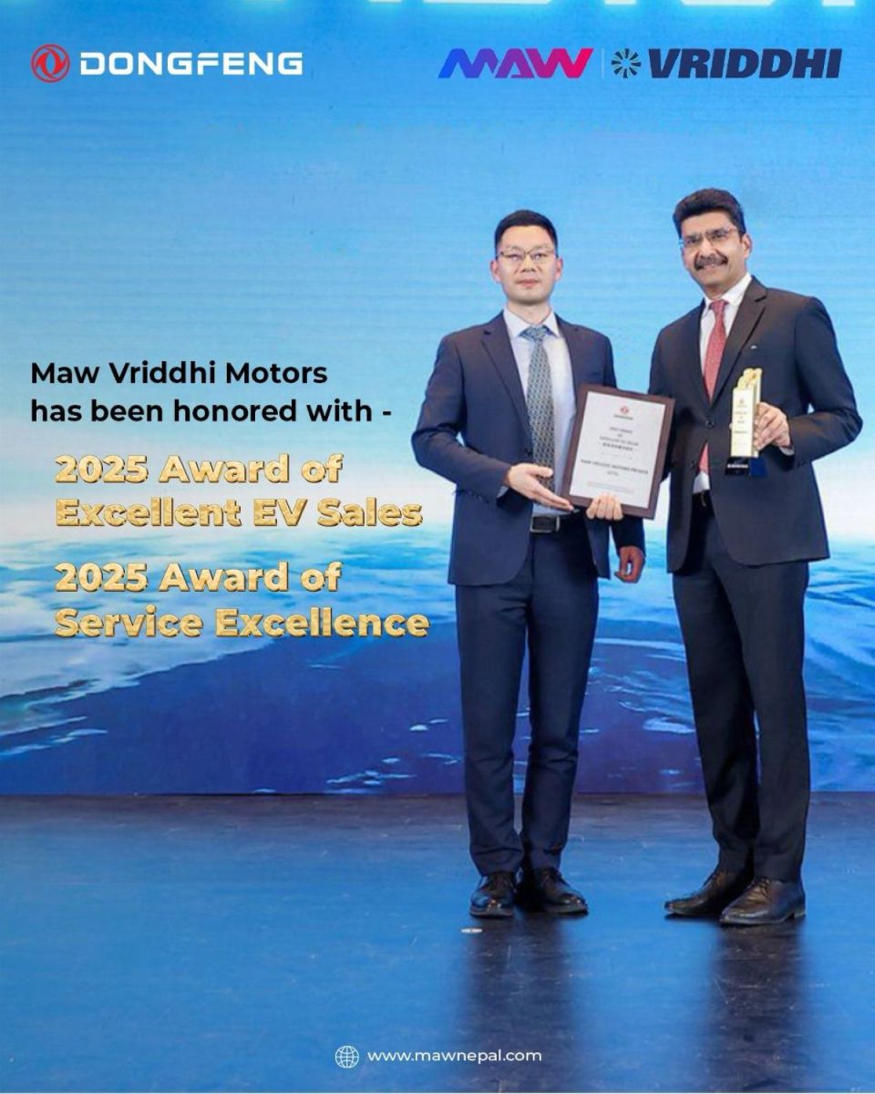 ‘इनर्जी, भिजन, फ्युचर’ थिममा सम्पन्न भएको २०२६ डोंगफेंग डिलर कन्फरेन्समा एमएडब्लू वृद्धि मोटर्सले ‘२०२५ अवार्ड अफ एक्सलेन्ट ईभी सेल्स’ र ‘२०२५ अवार्ड अफ सर्भिस एक्सलेन्स’ गरी दुई महत्त्वपूर्ण सम्मानहरू प्राप्त गरेको छ।