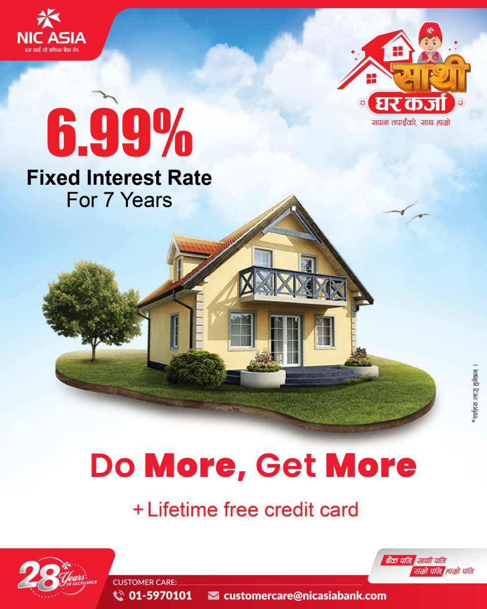 एनआई सी एशिया बैंकले ग्राहक महानुभावहरूको आवश्यकतालाई हरसम्भव पूरा गर्नका लागि रू. १० करोडसम्म घर कर्जा प्रदानगर्ने उद्देश्यअनुरुप ‘एनआई सी एशियासाथी घर कर्जा’ योजना सार्वजनिक गरेको छ । बैंकले सार्वजनिक गरेको यसघर कर्जा योजनाअन्तर्गत ७वर्षको लागि ६.९९ प्रतिशत स्थिर ब्याजदर एवं अन्यआकर्षक सेवासहित उपलब्ध हुनेछ ।