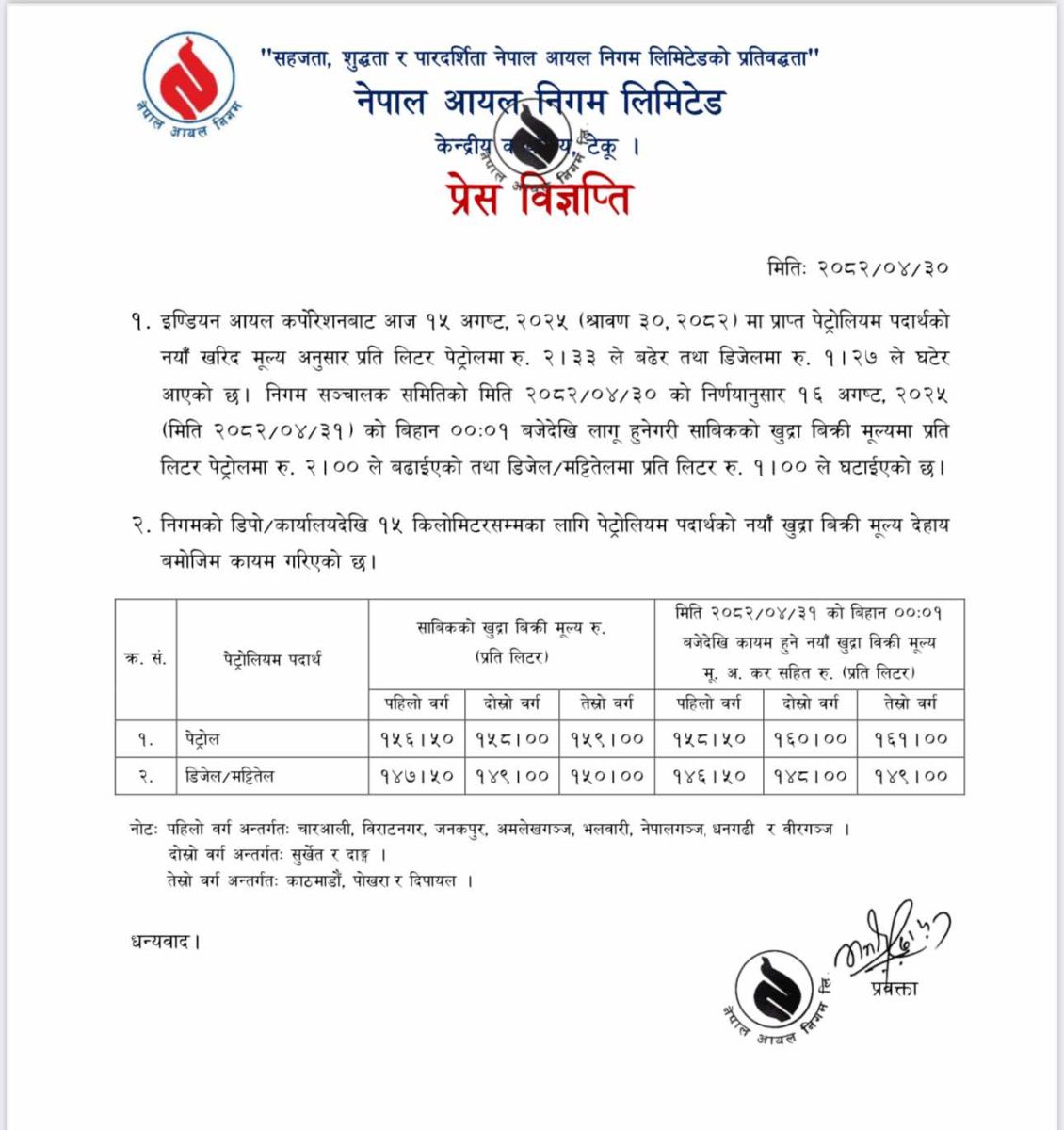 पेट्रोलको मूल्य लिटरमा दुई रुपैयाँ बढाएको र डिजेल र मट्टितेलको मूल्य लिटरमा एक रुपैयाँ घटाएको आयल निगमका कार्यकारी निर्देशक चण्डिका प्रसाद भट्टले जानकारी दिए ।