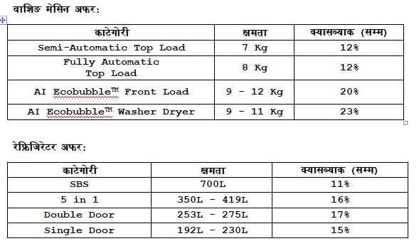 ग्राहकहरूले ७ के.जी देखि १२ के.जीसम्मका ए-आइ इकोबबल वाशर ड्रायर, फ्रन्ट-लोड, र सेमी-अटो मेटिक टप-लोडवाशिङ मेसिनहरूमा अधिकतम २३% सम्मको क्यासब्याक प्राप्त गर्न सक्नुहुनेछन्। त्यसैगरी, सिंगल डोर, डबल डोर र साइड-बाई-साइड रेफ्रिजरेटरहरुमा १७% सम्मको क्यासब्याक उपलब्ध छ।