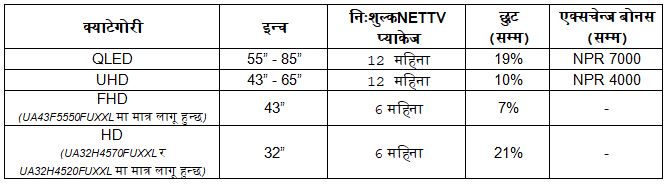 यसका साथै, मनोरन्जनको अनुभवलाई अझ राम्रो बनाउन, सामसङले २०२१ देखि २०२५ सम्म उत्पादन भएका टिभीको खरिद गर्दा आफ्ना ग्राहकहरूलाई रु ३००० सम्मको नि:शुल्क NETTV प्याकेज पनि प्रदान गर्दैछ। QLED र UHD मोडेल किन्दा १२ महिनाको निःशुल्क NETTV सब्स्क्रिप्सन पाइन्छ भने FHD र HD मोडेल किन्दा ६ महिनाको निःशुल्क NETTV सब्स्क्रिप्सन पाइन्छ।
