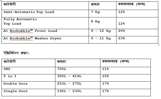ग्राहकहरूले 7KG देखि 12 KG सम्मका AI Ecobubble Washer Dryer, Front Load, FATL र SATL वाशिङ मेसिनहरूमा अधिकतम २३% इन्स्ट्यान्ट क्यासब्याक प्राप्त गर्न सक्छन्। त्यसैगरी, Single-door, Double-door र Side-by-Side Samsung Refrigerators मा अधिकतम 17% क्यासब्याक उपलब्ध छ।