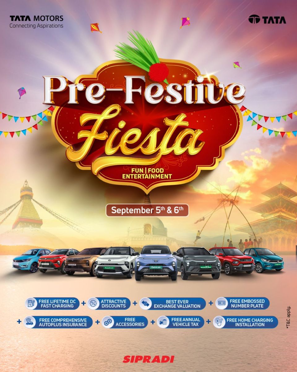 टाटा मोटर्सको नेपालका लागि एक मात्र आधिकारिक वितरक सिप्रदी ट्रेडिङ प्रा.लि.ले नजिकिँदै गरेको चार्डपर्वलाई लक्षित गर्दै ‘प्रि-फेस्टिभ फियस्टा’ विशेष कार्यक्रम सुरु गरेको छ । यो कार्यक्रम आज र भोलि अर्थात् भाद्र २० र २१ गते दुई दिन सञ्चालन हुनेछ।