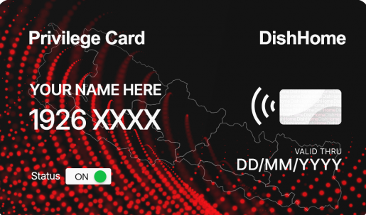डिशहोम ग्राहक प्रिभिलेज कार्ड पूरै भर्चुअल कार्ड हो, जुन एक्टिभ सदस्यता भएका ग्राहकहरूको माइ डिशहोम एपमा स्वचालित रूपमा देखिनेछ । यस कार्डमार्फत ग्राहकहरूले २५५ सम्म छुट पाउन सक्नेछन्, जुन विभिन्न साझेदार सेवाहरूमा लागू हुनेछ ।