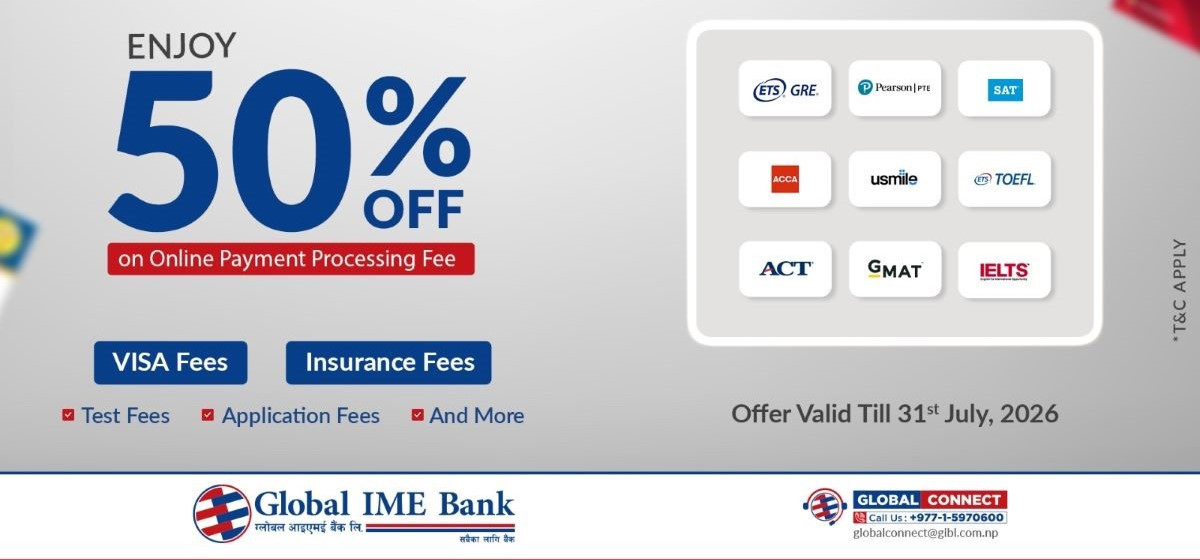 ग्लोबल आइएमई बैंक लिमिटेडले अन्तर्राष्ट्रिय शैक्षिक प्रयोजन जस्तै अध्ययन शुल्क, भिषा शुल्क, अनलाइन परीक्षा शुल्कहरुको लागि आवश्यक अन्तर्राष्ट्रिय अनलाइन भुक्तानीहरुको सेवा शुल्कमा ५० प्रतिशत छुट प्रदान गर्ने विशेष योजना सार्वजनिक गरेको छ ।