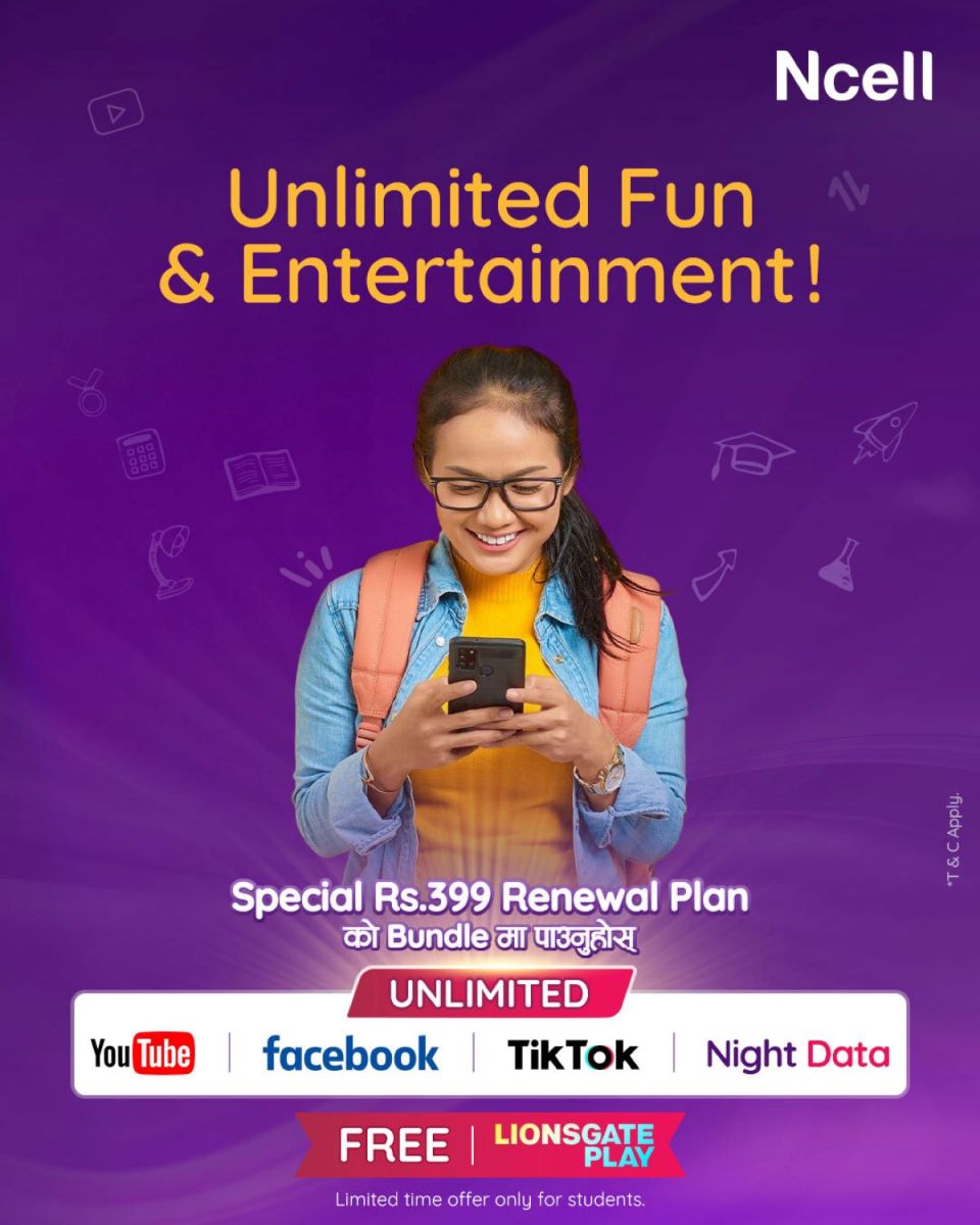 एनसेलले विद्यार्थीहरूका लागि विशेष रूपमा डिजाइन गरिएको ‘सधैं अन रिन्युअल’ प्लानहरु संचालनमा ल्याएको छ । २०८१ को माध्यमिक शिक्षा परीक्षा ९एसइई० दिएका लगायत सबै विद्यार्थीहरूलाई लक्षित यो स्टार्टर प्लान अफरले सुलभ दरमा मनोरञ्जनका साथै दूरसञ्चार सेवामा पहुँच सुनिश्चित गर्दछ ।