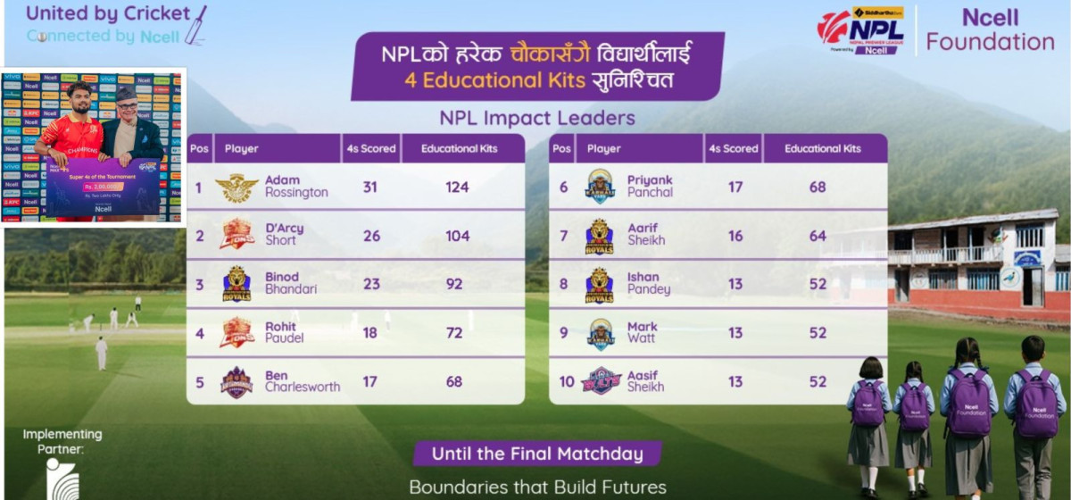 “यस अर्थपूर्ण सामाजिक पहलमा योगदान पु¥याउनु हुने सबै खेलाडीहरूलाई हामी हार्दिक बधाई तथा धन्यवाद व्यक्त गर्दछौं । उहाँहरूको प्रदर्शनले मैदानमा आफ्ना टिमलाई मात्र सशक्त बनाएको छैन, हरेक चौकाले विद्यार्थीको पठनपाठनमा पनि सहयोग पुर्याएको छ,” एनसेलकी कर्पोरेट कम्युनिकेसन तथा सस्टेनेबिलिटी निर्देशक बिषाखा लक्ष्मी खड्काले भनिन् । “गत वर्षझैं यस वर्ष पनि सम्बन्धित सरोकारवालाहरूसँग सहकार्य गर्दै यस्ता स्रोतको सबैभन्दा बढी आवश्यक पर्ने सरकारी विद्यालयका विद्यार्थीहरूलाई लक्षित गरी यी शैक्षिक सामग्रीहरू वितरण गर्नेछौं ।”