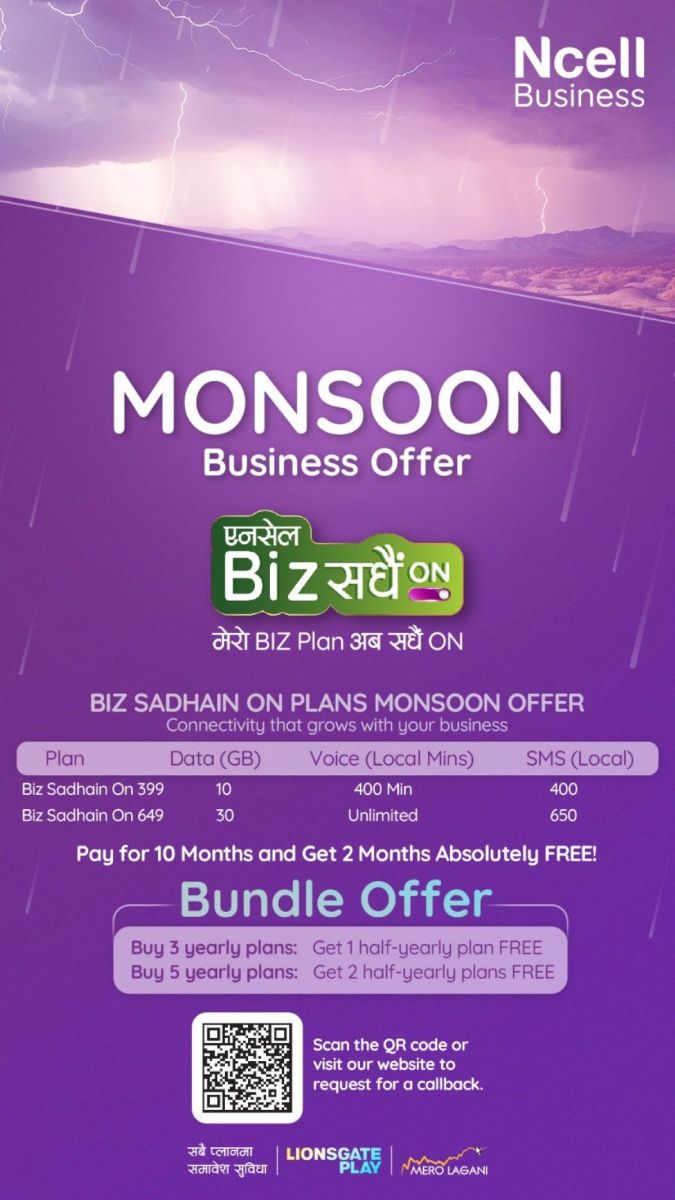 नेपाली व्यवसाय जगतलाई सशक्त बनाउने आफनो प्रतिबद्धता बमोजिम एनसेलले आफ्ना पोस्टपेड, साना तथा मझौला उद्यमी र कर्पोरेट ग्राहकहरूका लागि ‘बिज सधैं अन’मा मनसुन बिजनेस अफर ल्याएको छ । यो अफरमा ग्राहकहरूले कम खर्चमा पूरै एक वर्ष निश्चिन्त भई सेवाहरु उपयोग गर्न सकिने लगायतका सुविधाहरु रहेका छन् ।