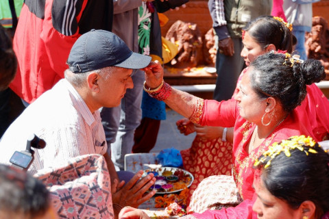 राष्ट्रपति रामचन्द्र पौडेलले बहिनीहरू शारदा पण्डित र चन्दा ओझाको हातबाट शुभसाइतमा यस वर्षको तिहारको टीका लगाएका छन्।