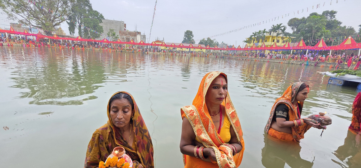 छठ पर्वअन्तर्गत ब्रतालुले सोमबार अस्ताउन लागेको सूर्यलाई अर्घ दिँदै छन्।