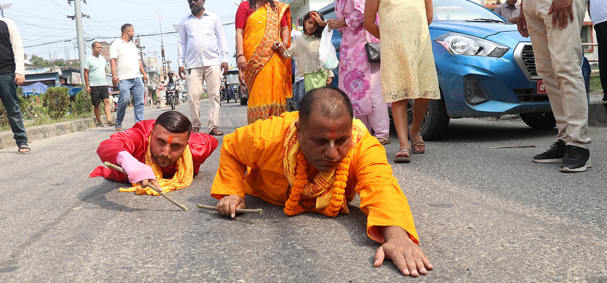 उनले मन्दिरबाट करिब साढे ३ किलोमिटर दण्ड प्रमाण गर्दै आफूले छठ पूजा गर्ने स्थल सिंघिया खोला पुगेका छन्।