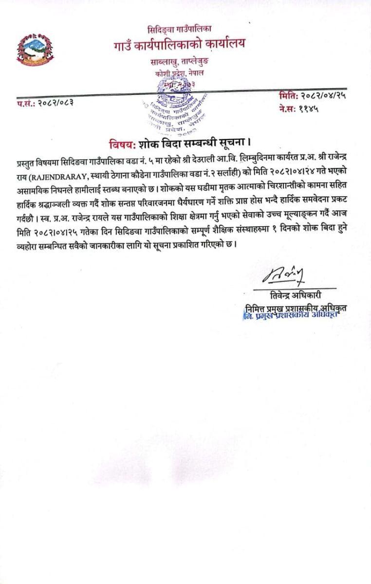 शिक्षकको निधनमा शोक मनाउन ताप्लेजुङको सिदिङ्वा गाउँपालिकाका विद्यालय आइतबार (आज)का लागि बन्द गरिएको छ।