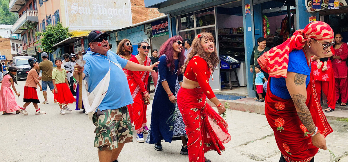 मङ्गलबार बागलुङ बजारमा नेवारी समुदायले निकालेको रोपाइँजात्राका महिलाको भेषमा सजिएका पुरुषले गाएको गीतको अंश हो यो। उनीहरू मुखियाको खेत रोप्न आएका रोपारहरू अवस्थामा सजिएका छन्। केही पुरुष भने बाउसेको भूमिकामा छन्।