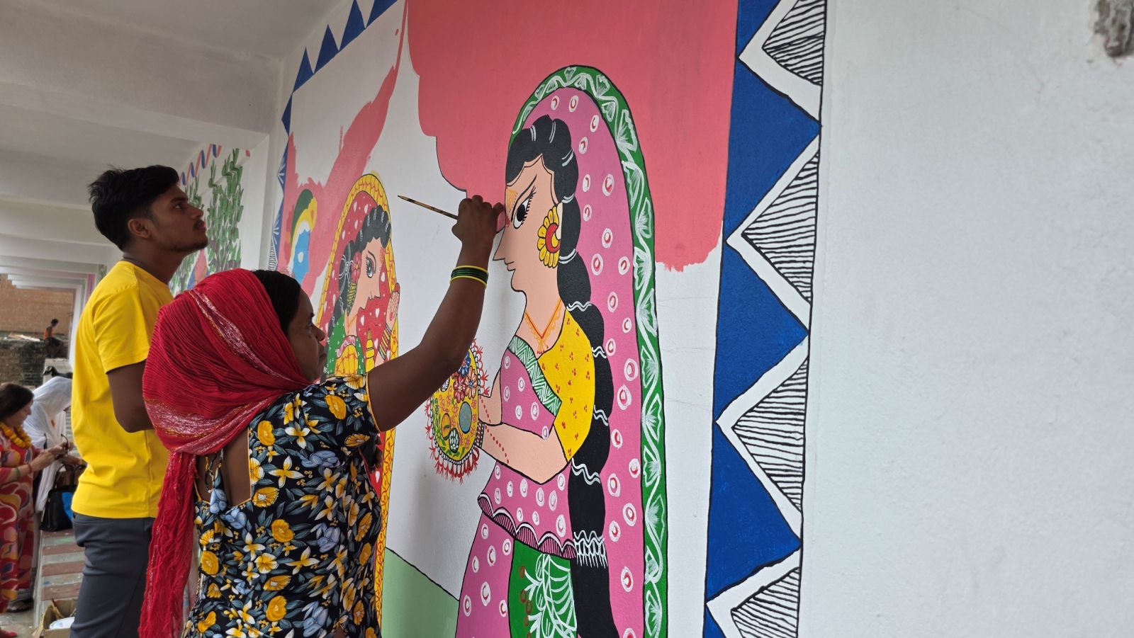 ‘पहिला स्केच बनाउनुपर्छ अनि मात्र रङ भर्नुपर्छ,’ मुनीले नागरिकसँग भनिन्, ‘भित्तामा सेतो रङ लगाएपछि स्केच कोरिन्छ। त्यसमाथि रङ भरिन्छ। रङ भरिएको चित्रकला गजब देखिन्छ।’ यस चित्रकलालाई तयार पार्न मुनीसहित थुप्रै चित्रकार खटिएका छन्।