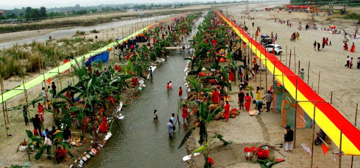 आइतबार विहानदेखि सुरु भएको छठ पुजाको आज मध्यदिन साँझ सूर्यलाई अघ्र्य दिएर घाटमै रातभर जाग्राम बसेर छठी माताको उपासना गर्न भक्तजनहरु भेला भईसकेका छन् । पुजाका लागि छरिएको नदीको पानीलाई एकत्रित गरेर साँघुरो खोला बनाइएको छ भने किनार वारिपारि व्यवस्थित रुपमा घाट बनाइएको छ ।