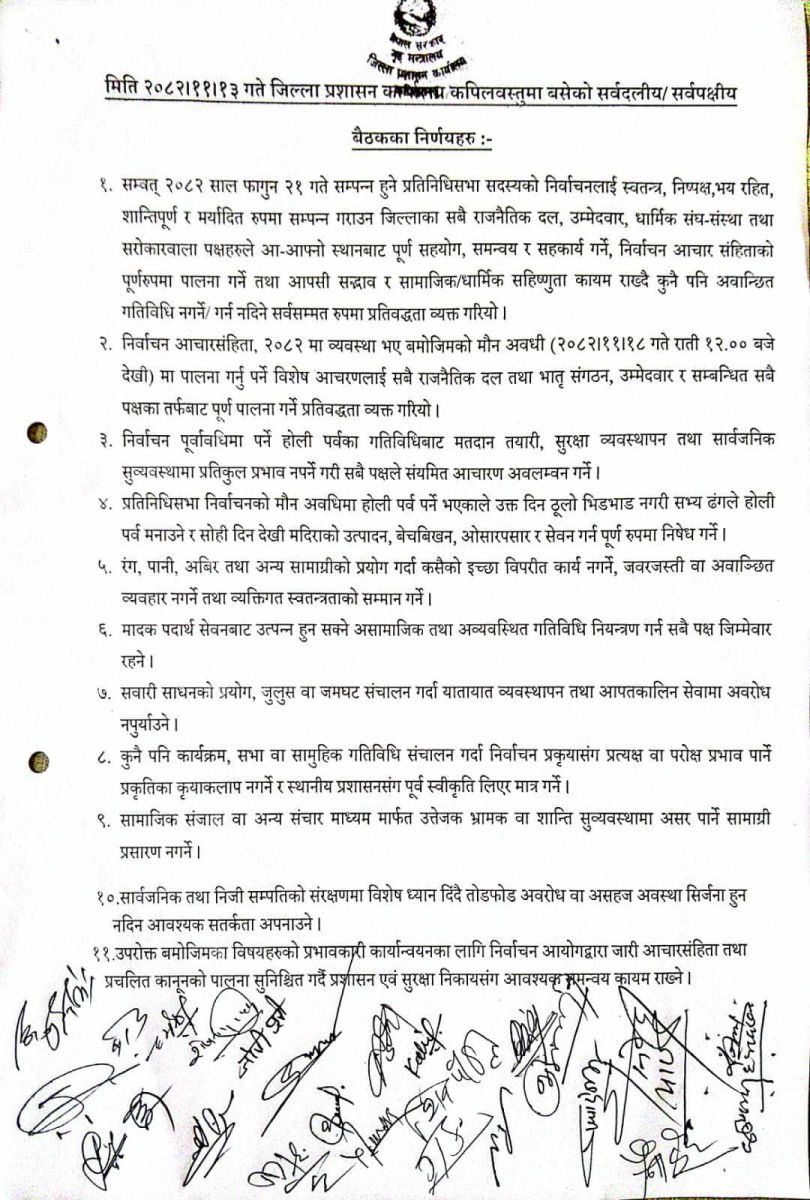 होली र निर्वाचनलाई लक्षित गरी जिल्ला प्रशासन कार्यालय कपिलवस्तुमा बसेको सर्वदलीय तथा सर्वपक्षीय बैठकले सोसहित ११ बुँदे निर्णय गरेको हो। बैठकमा फागुन २१ गते सम्पन्न हुने निर्वाचनलाई स्वतन्त्र, निष्पक्ष, भयरहित र शान्तिपूर्ण बनाउन सबै राजनीतिक दल, उम्मेदवार, धार्मिक सङ्घसंस्था तथा सरोकारवालाले पूर्ण सहयोग गर्ने प्रतिबद्धता समेत जनाएका छन्।