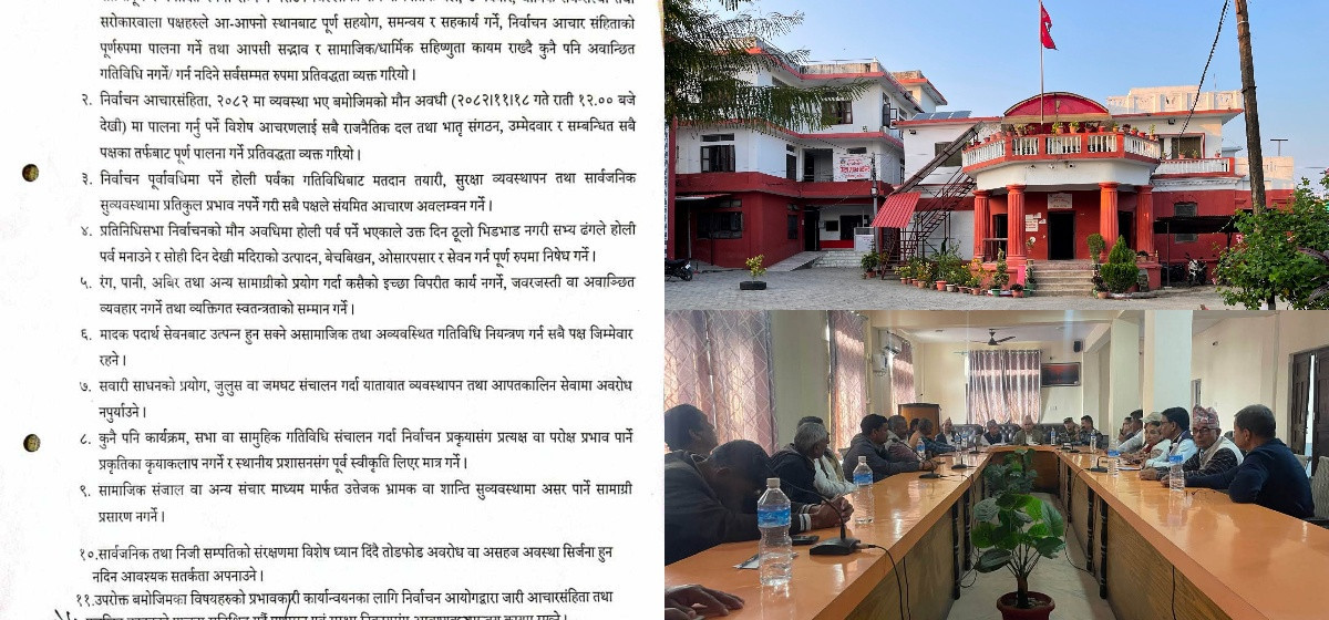 सामाजिक सञ्जाल वा अन्य सञ्चार माध्यममार्फत उत्तेजक, भ्रामक वा शान्ति सुरक्षामा असर पार्ने सामग्री प्रसारण नगर्ने, सार्वजनिक तथा निजी सम्पत्तिको संरक्षणमा विशेष ध्यान दिने र निर्वाचन आयोगद्वारा जारी आचारसंहिता तथा प्रचलित कानुनको पूर्ण पालना गर्दै प्रशासन तथा सुरक्षा निकायसँग समन्वय गरेर अघि बढ्ने निर्णय बैठकले गरेको छ। प्रजिअ जनार्दन गौतमले निर्वाचनको पूर्व सन्ध्यामा होली परेकाले सभ्य रूपमा मनाउन आग्रह गरे। यस्तै निर्वाचनलाई निष्पक्ष रूपमा सम्पन्न गर्न सबैले साथ दिनुपर्ने उनले बताए।