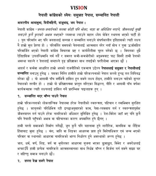 नेपाली कांग्रेसले मुलुकमा सुशासन र समुन्नति कायम गर्ने उद्देश्यसहित आफ्नो १० बुँदे विस्तृत भिजन सार्वजनिक गरेको छ। जनकपुरमा बुधबार आयोजित विशेष समारोहमार्फत सार्वजनिक गरिएको कांग्रेसको प्रतिज्ञापत्र मा ‘समुन्नत नेपाल, सम्मानित नेपाली’ भन्ने मूल नाराका साथ बुँदे भिजनसमेत सार्वजनिक गरिएको हो ।