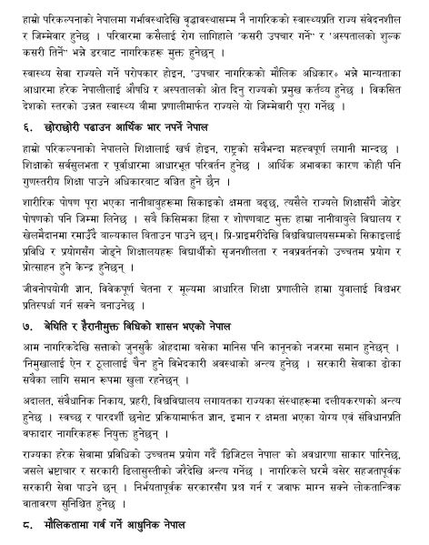 कांग्रेसले परिकल्पना गरेको नेपालमा नागरिकको आत्मसम्मानलाई पहिलो प्राथमिकतामा राखिएको छ । जात, धर्म, लिङ्ग वा क्षेत्रका आधारमा हुने विभेद अन्त्य गर्दै हरेक नागरिकले शिर ठाडो पारेर बाँच्न पाउने ‘सम्मानित नेपाल’ निर्माण गर्ने पार्टीको योजना छ।