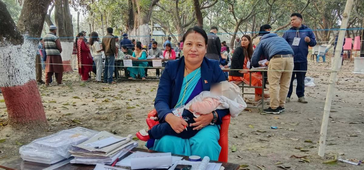 मतदान केन्द्रको एकतर्फ बसेकी मतदान अधिकृत अृमता केसीका लागि यो निर्वाचन अरू जस्तो सामान्य थिएन। उनी मतपत्रमा हस्ताक्षर गरिरहेकी थिइन्, तर उनका हातमा कागज र कलम मात्र थिएनन्, काखमा थिइन् उनकी ६ महिनाकी छोरी। मतदानको जिम्मेवारीसँगै मातृत्वको दायित्व पनि उनले सँगसँगै निभाइरहेकी थिइन्।