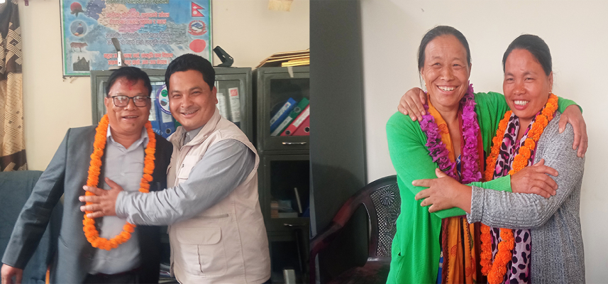 कुर्सीकाे छेउमा उभिएका नयाँ मेयर थापा घर्तीलाई अंगालो मारेर ५ वर्ष आफू बसेको कुर्सीमा बसाए। ‘बधाई तथा सफल कार्यकालको शुभकामना छ। जनताको मन जितेर काम गर्नुहोला।’ उनि जस्तै निवर्तमान उपमेयर मनकुमारी घर्तीले पनि नबनिर्वाचित उपमेयर गिता आचार्यलाई माला पछि अंगालो मारेर आफू बस्ने कुर्सिमा लगेर बसाईन्।