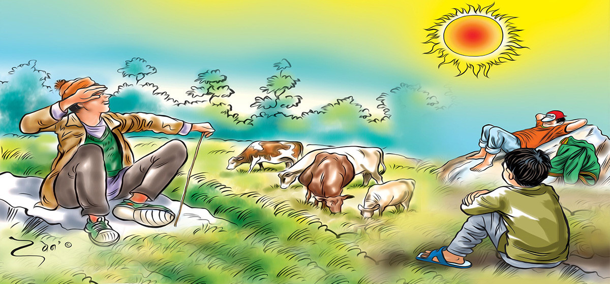 जब घाम पश्चिम लत्रन थाल्थ्यो, गाईको पेट माथि चुलिन थाल्थ्यो। तर हामी गोठालाका पेटमा रिक्तताको घण्टी बज्न थाल्थ्यो। छिमेकीका बगैंचामा चोर्नका लागि सधैं आलुबखडा र आरु पाक्थेनन्। केयरसिंहको नास्पाती पनि सधैं पाक्थेन।