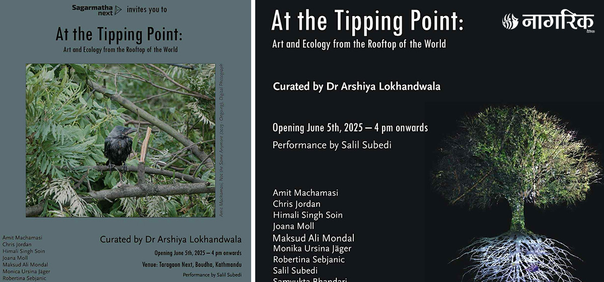 सगरमाथा नेक्स्टले आयोजना गरेको बृहत् कला प्रदर्शनी ‘एट द टिपिङ पोइन्टः आर्ट एण्ड इकोलोजी फ्रम द रूफटप अफ द वल्र्ड’ विश्व वातावरण दिवसको अवसर पारेर भोलि (बिहीबार) साँझ ४ बजेदेखि काठमाडौंको तारागाउँ नेक्स्टमा सुरु हुँदैछ।