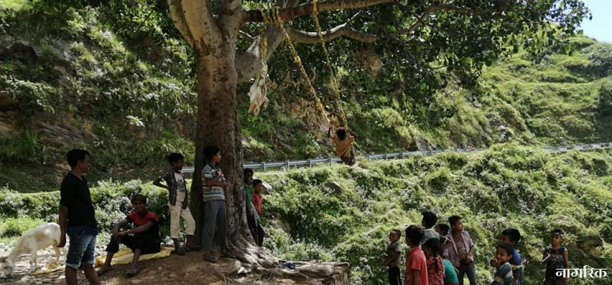 डोटीको सिलगढीस्थित पुन्ना गाउँमा ओल्के पर्वको अवसरमा पिङ खेल्दै बालबालिका । तस्बिर सौजन्य : दीपक खड्का