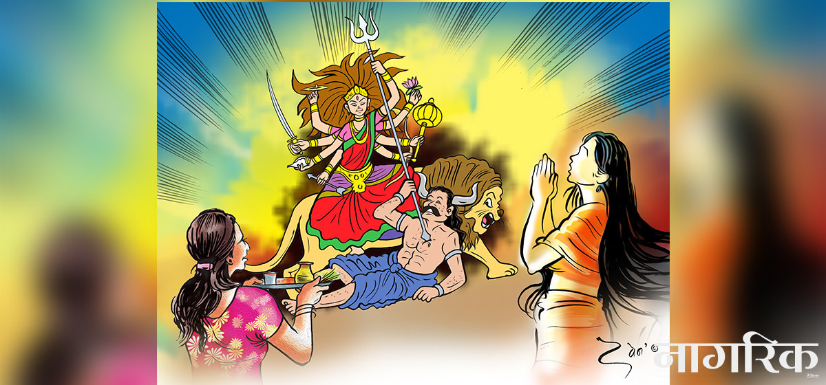 सांस्कृतिक पर्व दशैँमा विशेष गरेर देवी दुर्गाको पूजाआजा गरी धुमधामसँग मनाउने चलन छ। हिन्दू धर्मावलम्बी र बौद्धमार्गीले पनि दशैँ मनाउने गर्छन्। पारिवारिक भेटघाट, रमाइलो, खानपान, टीका, पिङ, यस पर्वको छुट्टै विशेषता देखिन्छ। लामो समयसम्म मनाउन सकिने चाड इष्टमित्र नातेदारसँगको जमघट, पारिवारिक पुनर्मिलनकै रूपमा पनि मनाइँदै आइएको छ। अझ यस दशैँको विशेष महत्व नवरात्रको नवौँ दिन देवीको पूजाअर्चना गरेर मनाउनुमा छ। दशैँको दिनबारे मिथक यो छ कि असत्यमाथि सत्यको विजय भएको अर्थात् रामले रावणसँग विजय प्राप्त गरेको, देवी दुर्गाले विश्वलाई नै आतंकित बनाउने असुर महिसासुरको वध गरी विजय हासिल गरेको आदि। देवीहरूलाई शक्तिशाली रूपमा देखाइको धार्मिक मिथक यो दुर्गाको शक्ति पनि एउटा हो। दशैँको नवरात्रि पूजाकै क्रममा पञ्चकन्यालाई देवीको रूप मानी टीका लगाइदिएर दान–दक्षिणा गर्ने चलन छ। कुमारी, बिहे नभएकी, सकभर महिनावारी पनि नभएकी कथित उच्च जातभित्रकी पञ्चकन्या खोजेर टीका लगाउने र त्यस कार्यबाट आफूलाई पवित्र महसुस गर्ने चलन आजसम्म छँदैछ। यसरी एकातिर धार्मिक अनुष्ठानले महिलालाई सम्मान गरेको पनि देखाउँछ, अर्कोतिर महिलाका नियमित प्राकृतिक प्रक्रिया, महिनावारी, वैवाहिक सम्बन्ध र दलित महिलालाई शुद्ध र चोखो मान्दैन। यस्तै व्यवहारात्मक पक्षहरू हिन्दू धर्ममा देखिएका असमान सम्बन्ध हुन् भन्न सकिन्छ। यस्तै कुरालाई हो, एक सचेत व्यक्तिले केलाउनुपर्ने।