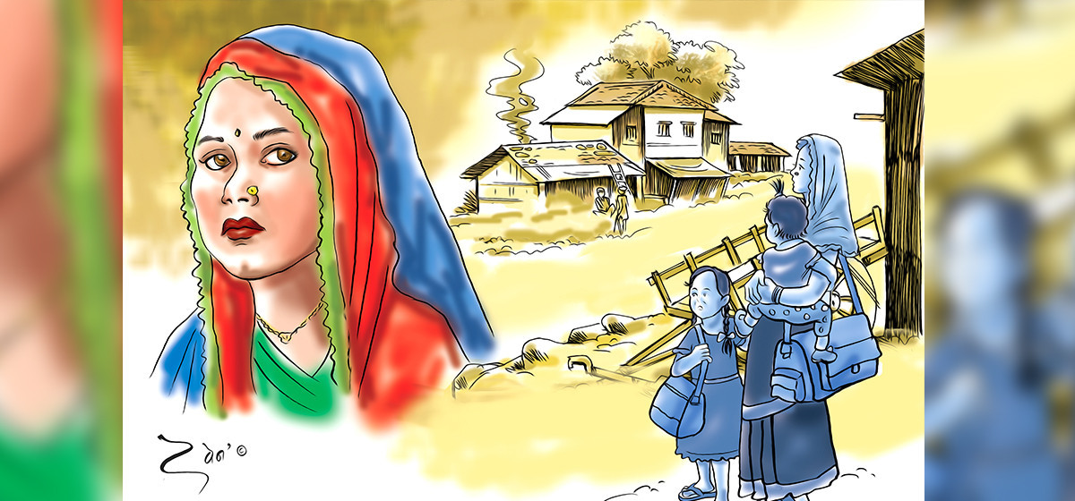 म कस्ती सोझी रहिछु! आफूलाई नबोलाएपछि मैले उनलाई पनि घर जान नदिनुपर्ने ? मैले किन उनलाई घर पठाएँ ? हो, म यसरी भागेर बस्न सक्दिनँ। तर के गरुँ? मेरो दिमाग ढिला चल्छ। चाँडो चलेको भए उनीसँग म पनि गाउँ पुगिसकेकी हुन्थेँ। थुइक्क ! यो मेरो बुद्धि। चाहिने बेला यो दिमाग नै नचल्ने। भोलिपल्ट बिहानै उठेँ। पसल खोल्न मन लागेन। छोरीहरूलाई पनि स्कुल पठाइनँ। छोरीहरूलाई भनेँ, ‘आज हजुरबा–हजुरआमा र मामालाई भेट्न जाने।’ यसो भनेपछि उनीहरू खुसी भएका थिए।