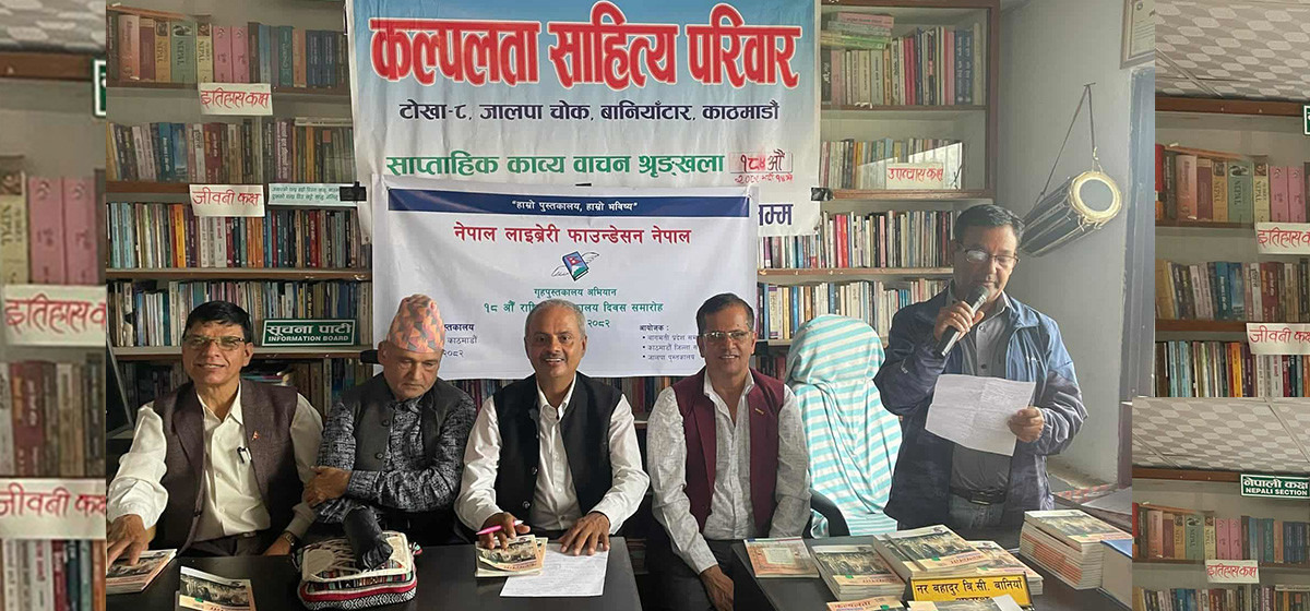 कार्यक्रममा कल्पलता द्वैमासिक पूर्णाङ्क १७ लोकार्पण गरिएकाे थियाे। कल्पलता साप्ताहिक काव्यवाचन १८४औं श्रृङ्खला अन्तर्गत केही साहित्यकारले पठन संस्कृति र पुस्तकालय सम्बन्धी रचना वाचन गरेका थिए।