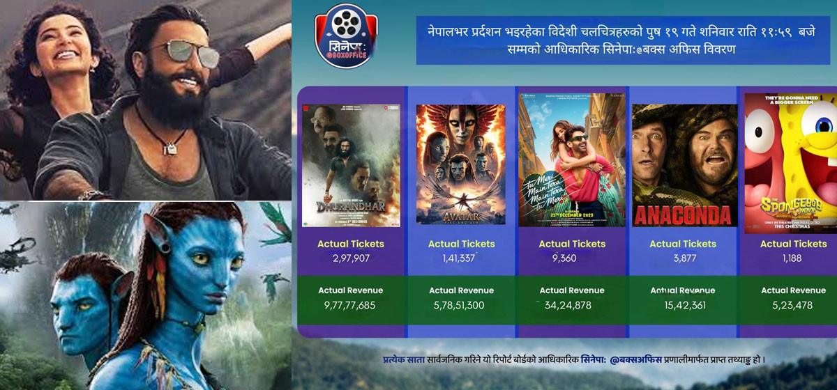 यस्तै, हलिउड चलचित्र अवतार ३ ले पनि नेपालमा राम्रो कमाइ गरिरहेको छ। चलचित्र विकास बोर्डका अनुसार उक्त चलचित्रले ५ करोड ७५ लाख ५१ हजार ३०० रुपैयाँको व्यापार गरेको छ। अवतार ३ का १ लाख ४१ हजार ३३७ वटा टिकट बिक्री भएका छन्।