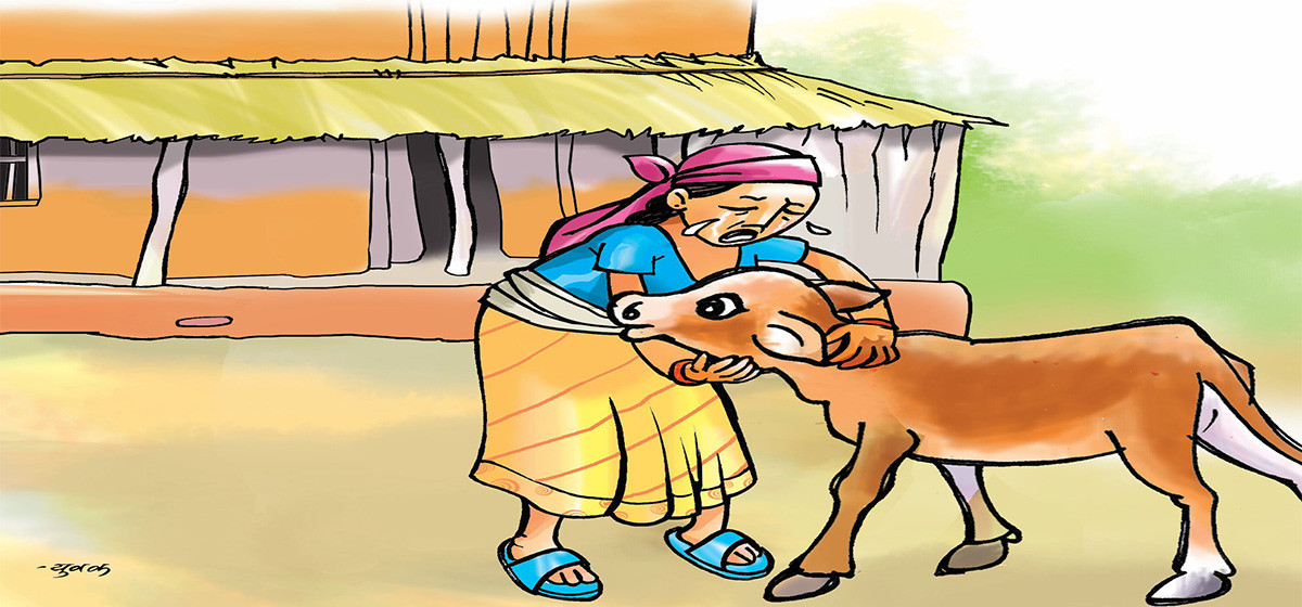 आमा नजिक आउँदा बाच्छोका आँखाले सोध्छन्– किन एक्लै छोडेर जानुभयो? पुकारसँगै प्रश्न पनि गरिएको हुन्छ।