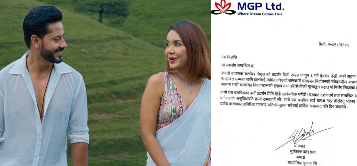 चलचित्र ‘बिगुल’को प्रदर्शन मिति स्थगित गरिएको छ । फागुन १ गते रिलिज गरिएको चलचित्रलाई बुधबारदेखि अर्को सुचना नभएसम्मका लागि प्रदर्शन स्थगित गरिएको जानकारी निर्माण पक्षले गरेको छ ।
