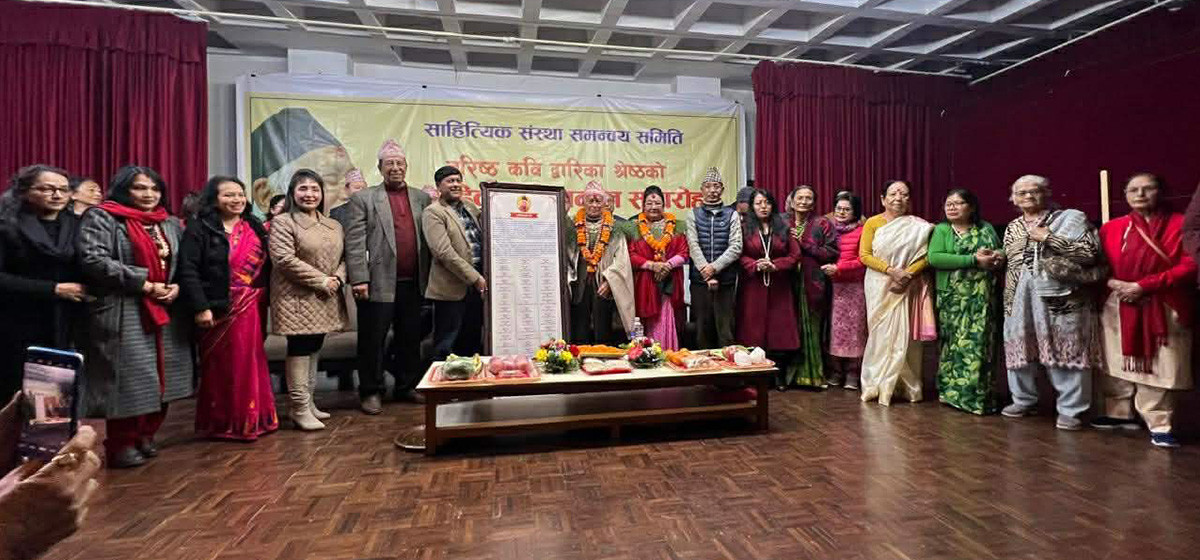 नेपाली भाषा, साहित्य, कला, संस्कृति र साहित्यिक पत्रकारितामा योगदान गर्दै आएका एकाउन्न संस्थाको साझा मञ्च ‘साहित्यिक संस्था समन्वय समिति’ ले ९१ वर्षीय वरिष्ठ कवि द्वारिका श्रेष्ठलाई सामूहिक अभिनन्दन गरेको छ।