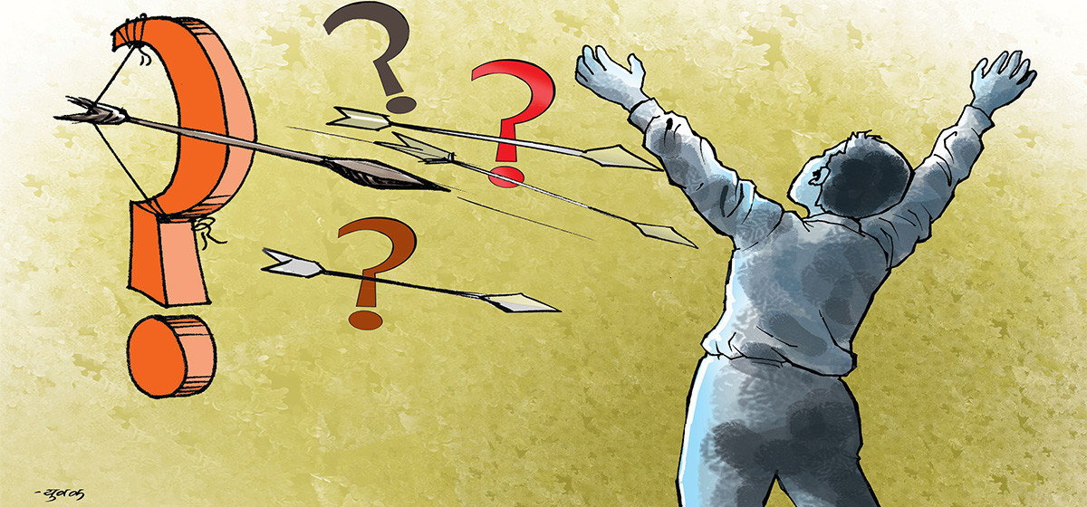 यहाँ प्रश्नको निषेध गरिएको होइन। वास्तवमा प्रश्नजस्तो प्रश्नले नै समाजलाई जिउँदो बनाउने हो। प्रश्न नउठ्ने समाजमा जडशान्ति मात्र हुने हो, त्यस्तो शान्ति जहाँ लुप्त भयले सधैं सताइरहन्छ। प्रश्न गर्नु अराजकताको द्योतक होइन, चेतनाको उच्चतम रूप हो। प्रश्नले सत्तालाई नाङ्गो बनाउँछ, परम्परालाई कठघरामा उभ्याउँछ। इतिहास हेर्ने हो भने जडसमाजमा प्रश्नकर्तालाई अपराधी करार गरियो। सुकरातलाई विष पिलाइयो, ग्यालिलियोलाई मौन गराइयो, बुद्धलाई विघटनकारी ठहर्याइयो, बिपीलाई देशद्रोही बनाइयो। वास्तवमा सभ्यता सधैं प्रश्नको घेरामा हुन्छ। समाजले त विद्र्रूप बनाइदिन्छ प्रश्नकर्तालाई। वास्तवमा प्रश्नले नै मान्छेले आफैंलाई, आफ्नो समयलाई र आफ्नो सत्तालाई निरन्तर सोधिरहन्छ– हामी ठिक बाटोमा छौं त?