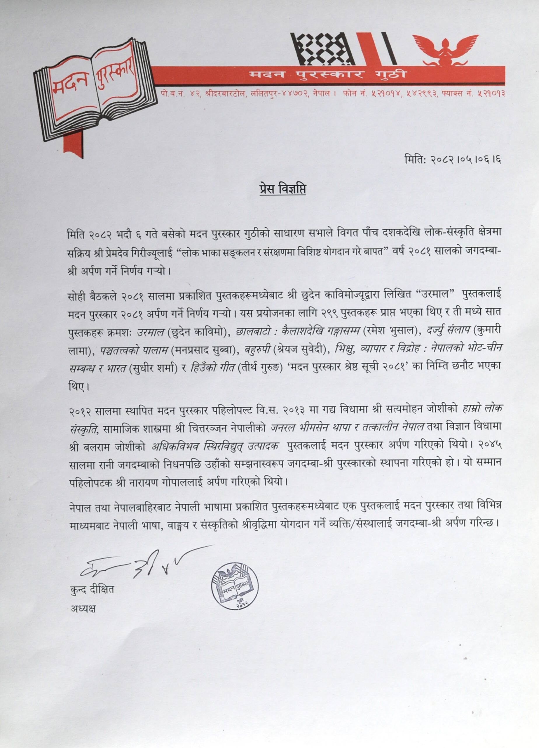 मदन पुरस्कार गुठीले २०८१ सालको मदन पुरस्कार र जगदम्बा–श्री सम्मानको घोषणा गरेको छ।