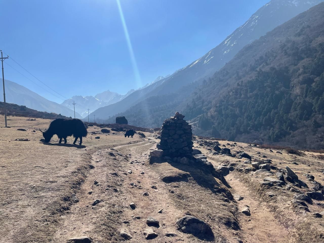 सूर्योदयको उज्यालो फैलिसकेको छ। हेडलाइटको आवश्यकता नपर्ने गरीकन। साढे पाँच बजेतिर बाटो ओरालो लाग्छ। याला चुलीतिरबाट आएको खोला (स्थानीय नाम छुबिछु) भेटिन्छ। परबाट झोलुंगे पुलजस्तो देखिए पनि त्यो खानेपानीको पाइप रहेछ। तलतिर खोलाका ढुंगाहरू नै खाँदिएर गोरेटो बनेको छ। दायाँतिर लाङटाङ खोला बगिरहेको छ। तल पुगेर यी दुई खोला मिल्छन्, जहाँको समथर सतहमा पानी तालझैं फैलिएको छ।