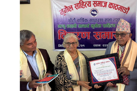वरिष्ठ साहित्यकार सृजन लम्साल (पूर्णचन्द्र शर्मा लम्साल) लाई झगु -लक्ष्मी आचार्य भूगोल साहित्य पुरस्कार प्रदान गरिएको थियो।
