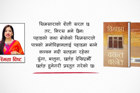 कला सिमसारा: फुल्न बिर्सिएको पैँयुको कथा भर्खरै बजारमा आएको बसन्त बस्नेत लिखित उपन्यास सिमसारामा उपन्यासको पात्र बिजुवा बाजेले पैयुँ र गोगनको कथा यसै भनेर समाप्त गरेका छन्। अस्मिता विष्ट १५ मंसिर २०८१ शनिबार १० मिनेट पाठ Facebook Twitter Linkedin