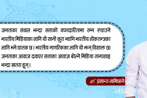 भारतीय मिडिया भनेपछि धेरै कुरा भन्नै पर्दैन। अझ त्यसमा पनि त्यहाँका टेलिभिजन, मिडियालाई बद्नाम गराउने मामलामा एक नम्वर भन्दा पनि अघि कुनैं अंक भए त्यसमा पुग्न चाहन्छ। अहिले भारतीय न्यूज च्यानल खोलियो भने पहिलो पटक हेर्ने मानिसलाई त्यो कुनै ‘सर्कस’ को न्यारेसन हो वा समाचार छुट्याउन मुस्किल पर्छ।